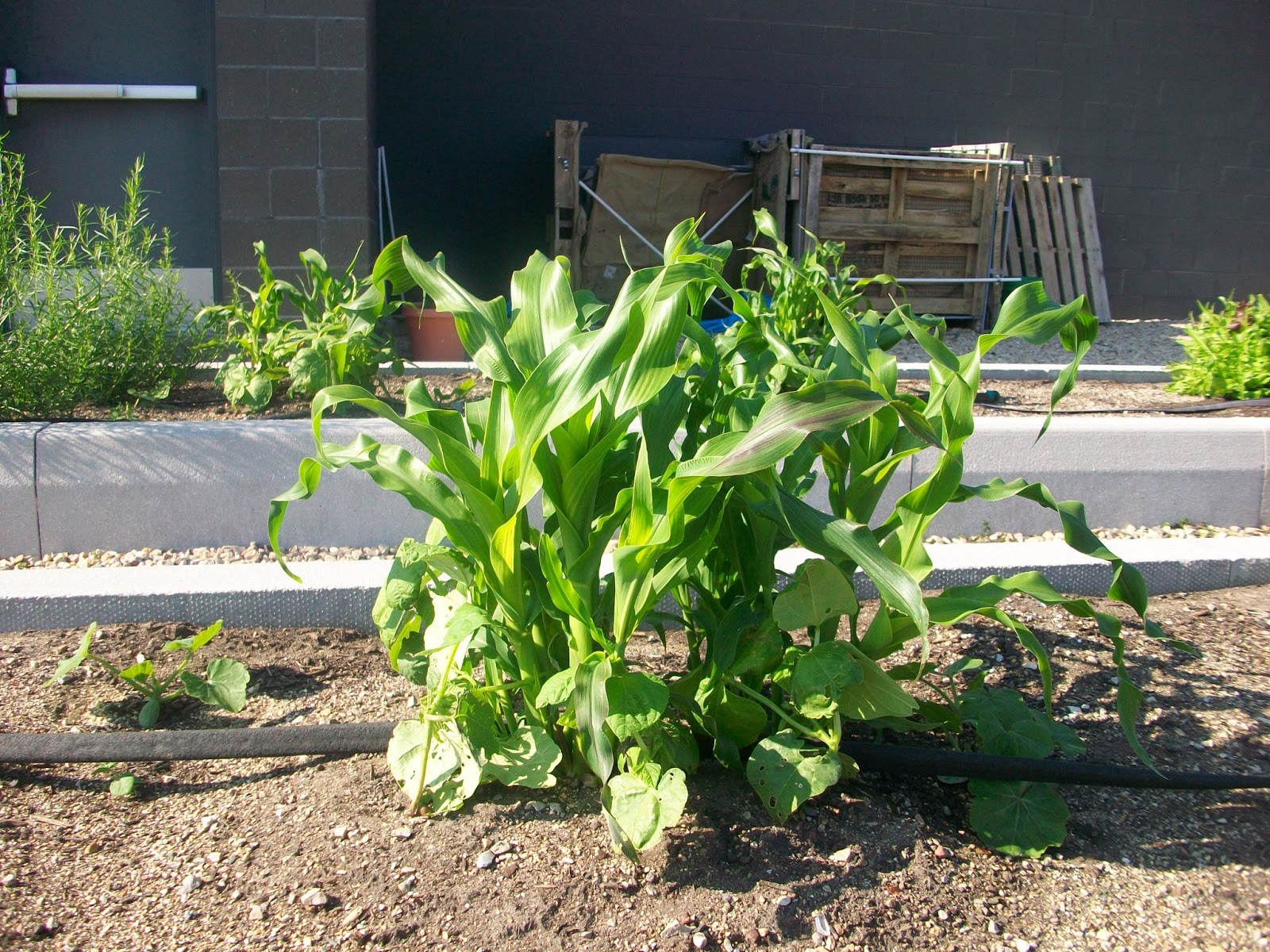 One of four Three Sisters gardens featuring Hopi blue corn, Kentucky pole beans and Winter squash. |